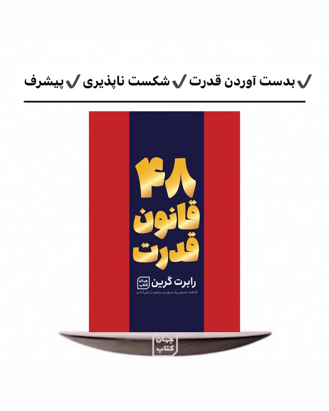 ترجمه بسیار قوی از کتاب ۴۸ قانون قدرت و بدون حذفیات… برای هر قانونش وقت بزار درکش کن هر قانون ممکنه زندیگتو تغییر بده… میتونی با این قوانین ریتم خیلی چیزارو عوضکنی… میتونی با یاد گرفتن این قوانین از مکر و حیله خیلیا آگاه بشی و جایگاه دوست و دشمنت رو پیدا کنی… با این کتاب میفهمی که خیلی مواقع دشمنت برات امن تر از دوستت… کتاب قطع رقعی جلد گالینگور بدون سانسور