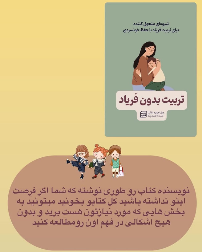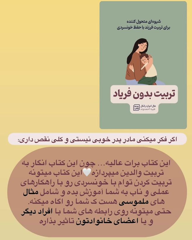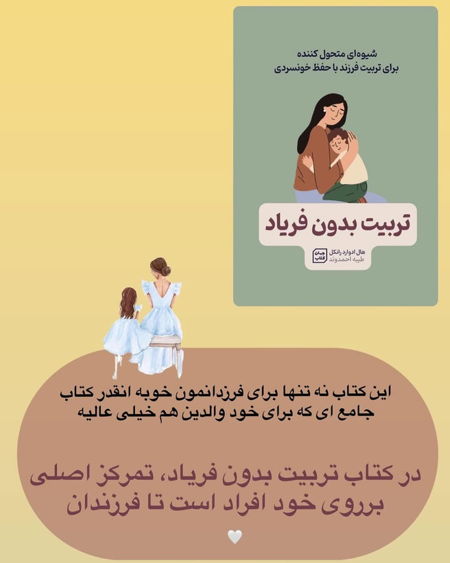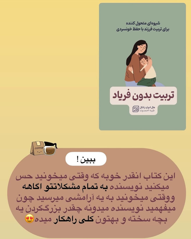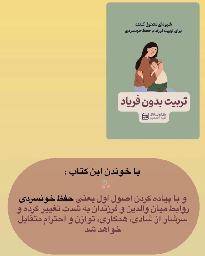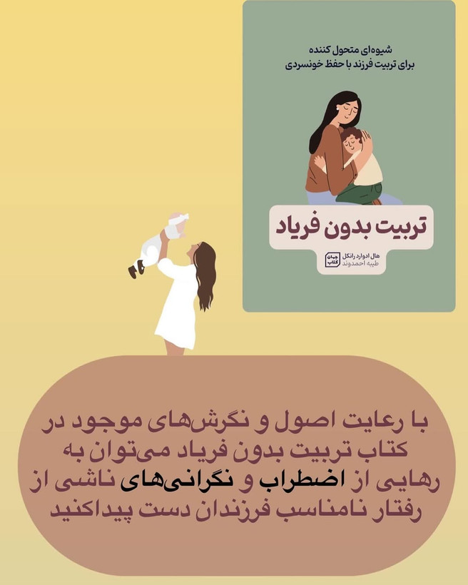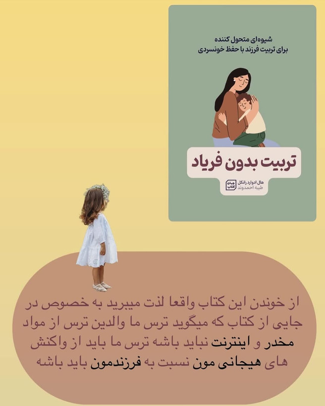 ورق بزن تا با کتاب بیشتر آشنا بشی کتاب تربیت بدون فریاد نوشتهی هال ادوارد رانکل کتابی تربیتی با رعایت اصل حفظ خونسردی سعی در آرام کردن دنیا و تربیت بدون فریاد داردسنده اعتقاد دارد با پیاده کردن اصول اول یعنی حفظ خونسردی روابط میان والدین و فرزندان به شدت تغییر کرده و سرشار از شادی، همکاری، توازن و احترام متقابل خواهد شد. متن و ترجمه کتاب تربیت بدون فریاد بسیار عالیه … متن رون و قابل فهمی داره .. کتابی که دوست داری بخونی و به همه هم پیشنهاد بدی